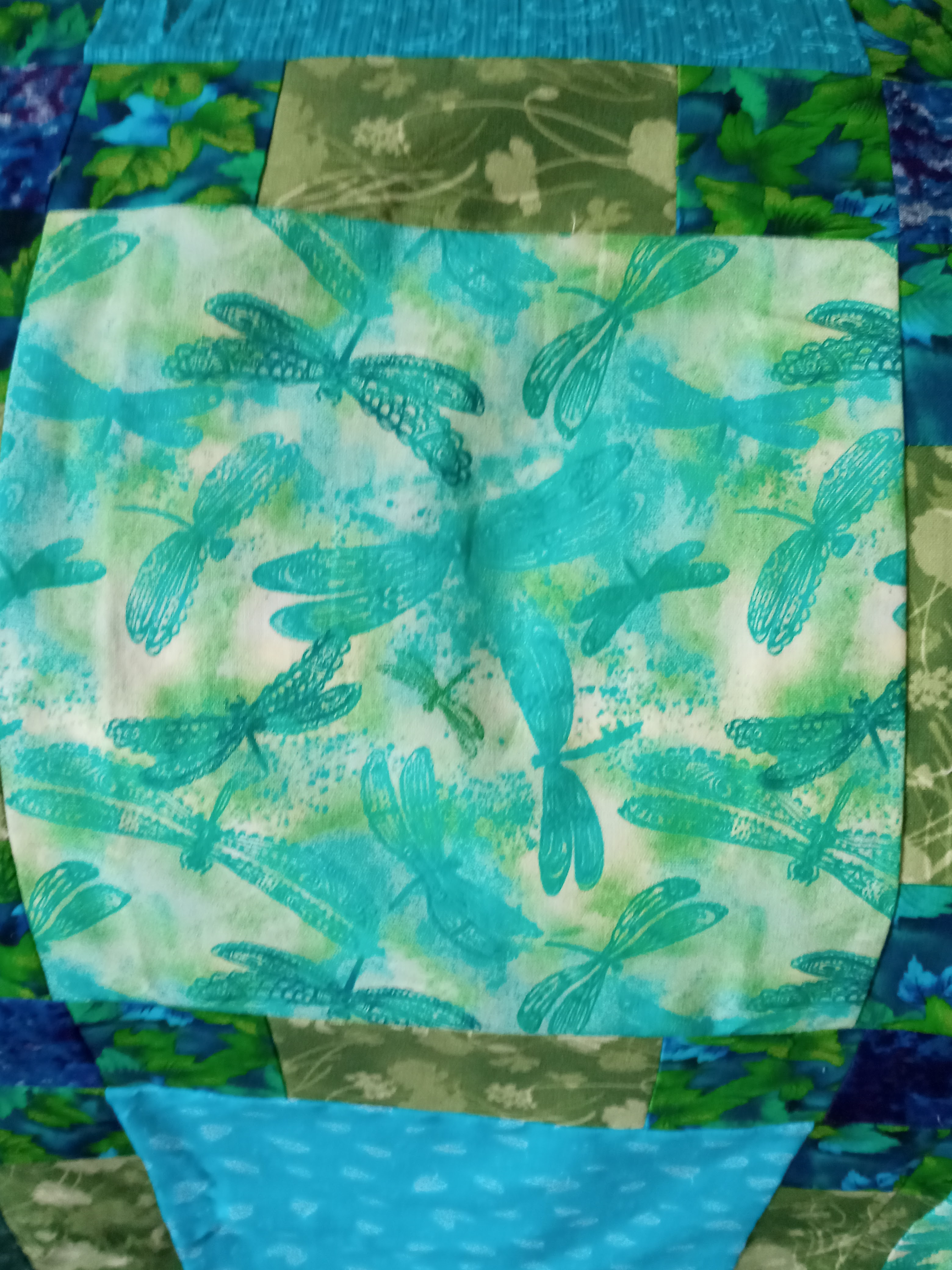 These were inspired by the green quilt. I'm still trying to use up green scraps. I used 8" blocks of this lovely dragonfly fabric. The sashing in this one were someone else's scraps. I enjoy taking someone else's leftovers and coming up with a suitable design. This map patterned fabric will be the backing.